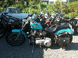ハンドルちょいと持ち上げて手前に引いたら、ナビのホルダーが干渉してスピードメーターが見えなくなった。まあ、こういうバイクなので速度計なんて見えようが見えまいがどうでもいいようなもんではあるし、そもそもこのメーター、ホントに信じていいのかという疑問もあるんだけど、取り締まり多発地点を通るときや周囲に白黒車両がいるときなど、やっぱりメーター見えないと気持ち悪いのでちょいとメーター位置を変えるべくまたまた大磯ハイライトへ。そしてKRTTなんてののエンジン始動に立ち会ったりしてたわけだけど、ここんちの人はこんなバイクいぢったり自身もCB72とかでレースに出てる(このへんはまたやたらにマニアな店が茅ヶ崎に!!)人なので、そういう話になってたら、奥から出てきちゃったぜ、こんなカタログ。自分の文章との、1983年以来の再会かも。ヽ(・◇・ )ノ てなわけで、しばらくはレースやスーパースポーツの話題で盛り上がっちゃったんだけど、しかし表に出てみれば、ワシの81年製バイクでさえ新しい部類に入っちゃう、バイカーな工場なのがオモロイ。