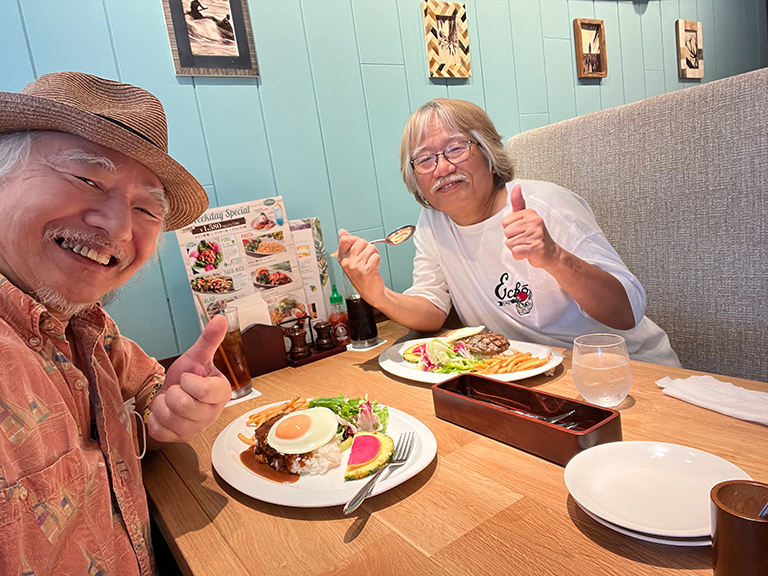 茅ヶ崎に比較的最近できた、ハワイアンなレストラン。ま、横浜ならすでに5軒くらいある、すかいらーく系列のファミレスだ。平日5時までのパンケーキ付きメニューから、ロコモコをチョイス。