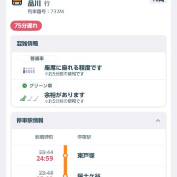 • 23時23分茅ヶ崎発の732M。すでに30分止まってるけど、運転再開見込みが0時30分に延びた。